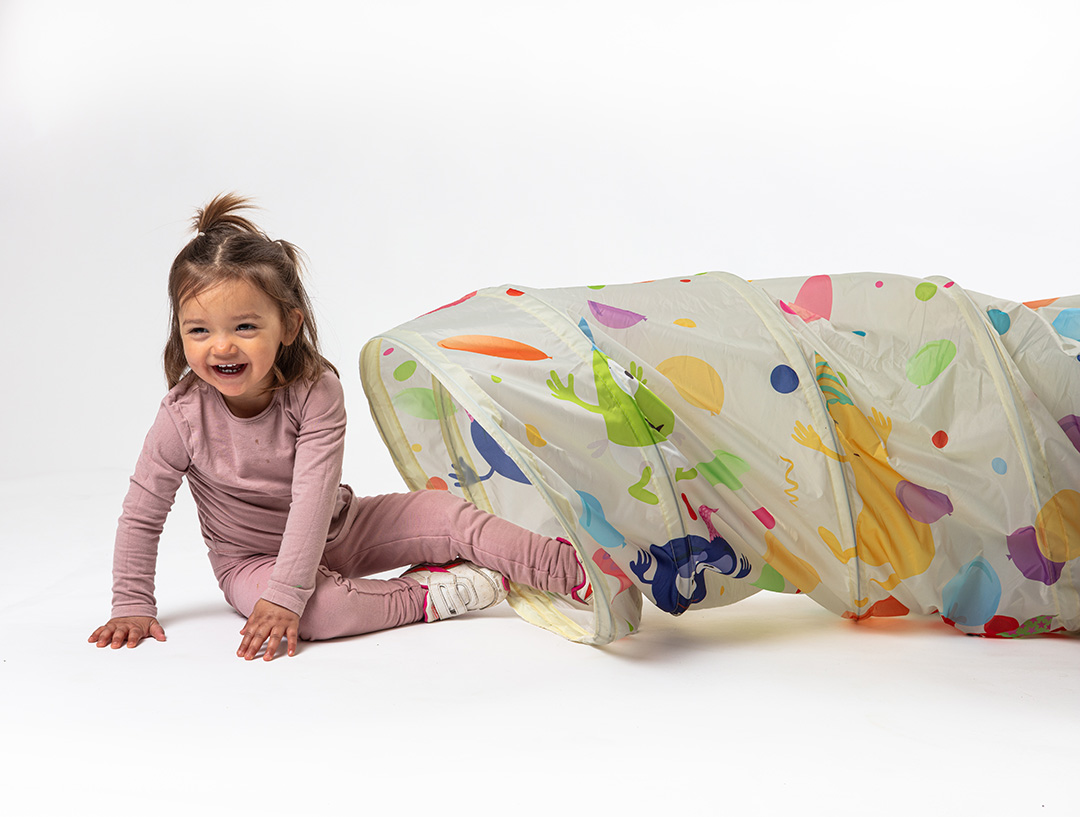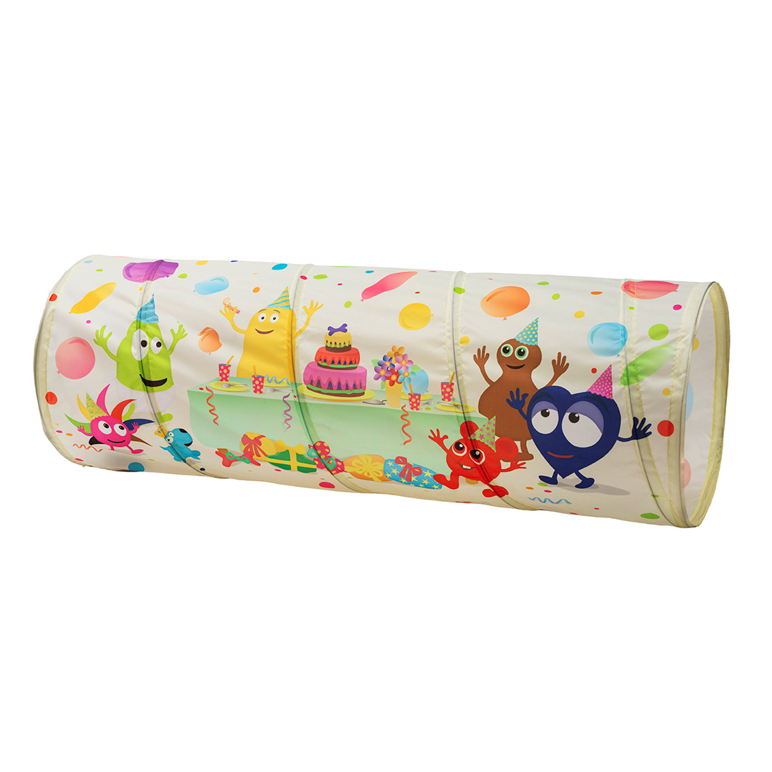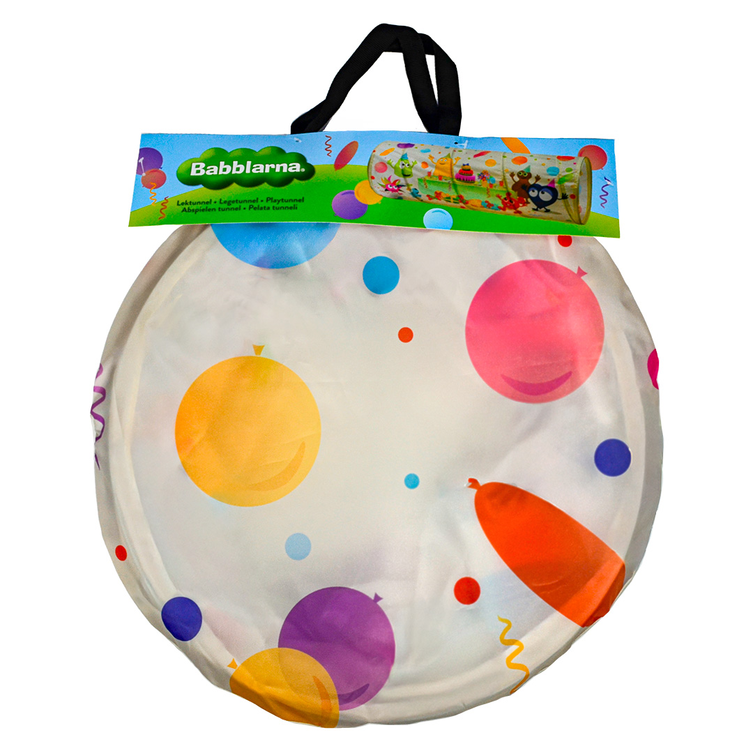 Lektunnel som bjuder på lek och bus. Kan användas både inne och ute. Lätt att vika ihop. Förvaras i medföljande förvaringspåse.
