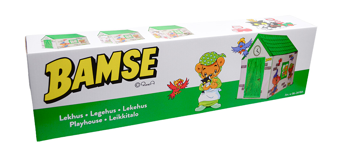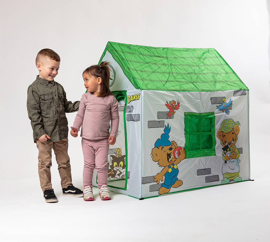 Rymligt lekhus med Bamse och hans vänner. Lätt att montera, instruktioner medföljer. Passar både inne och ute. Fäst gärna huset i marken vid användning utomhus i blåsigt väder. Tältpinnar medföljer ej. Finns att köpa separat (art.nr. 34-9015).