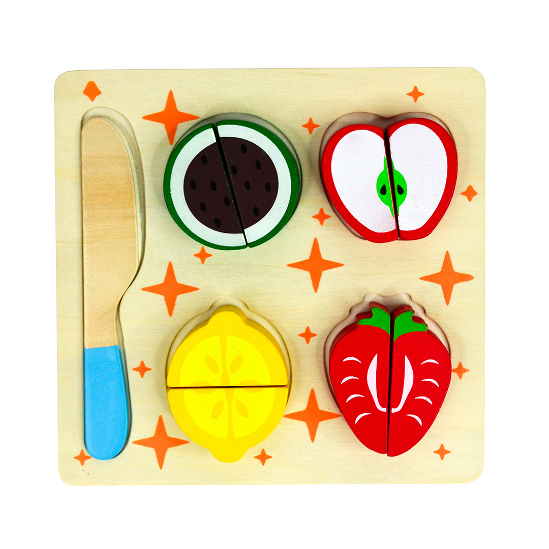 Delbara frukter kommer med en kniv och fyra delbara frukter som sitter ihop med kardborrefästen som går att dela för att sedan sätta ihop igen.