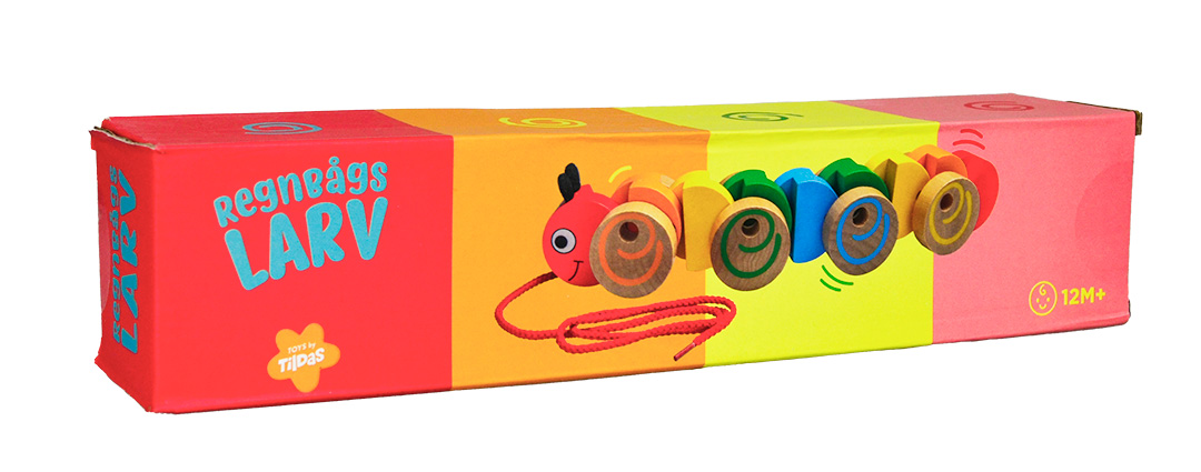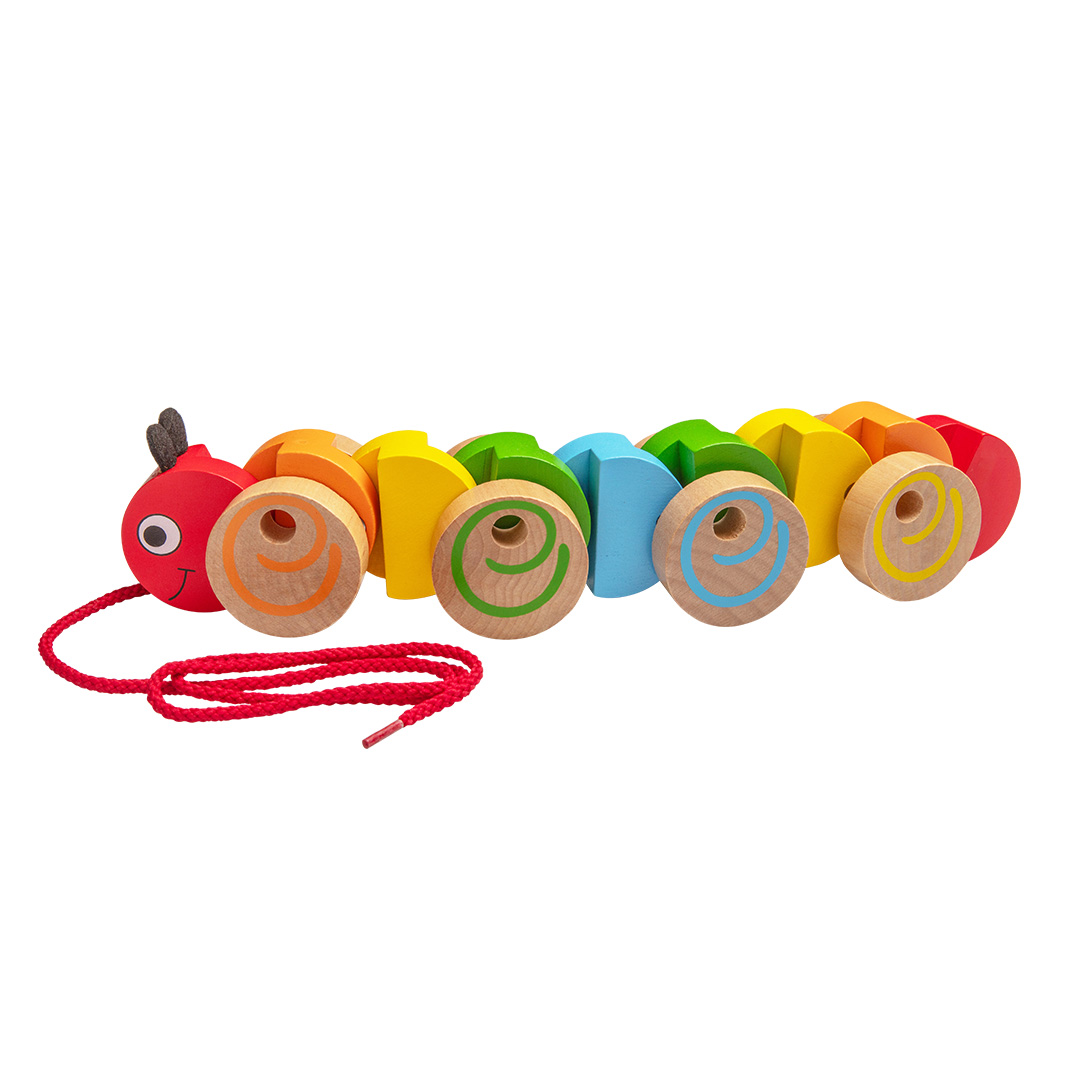 Denna färgglada dragleksak föreställer en larv med hjul som rullar när barnet drar den. En spännande leksak som uppmuntrar till rörelse och stimulerar fantasin.